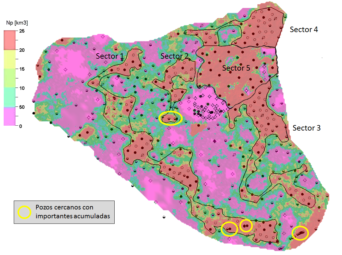 En el mapa adjunto, además de los sectores a perforar, se indican antiguos pozos cercanos entre sí que alcanzaron importantes acumuladas. Estos pozos, son antecedentes demostrativos de la bondad de la perforación infill.